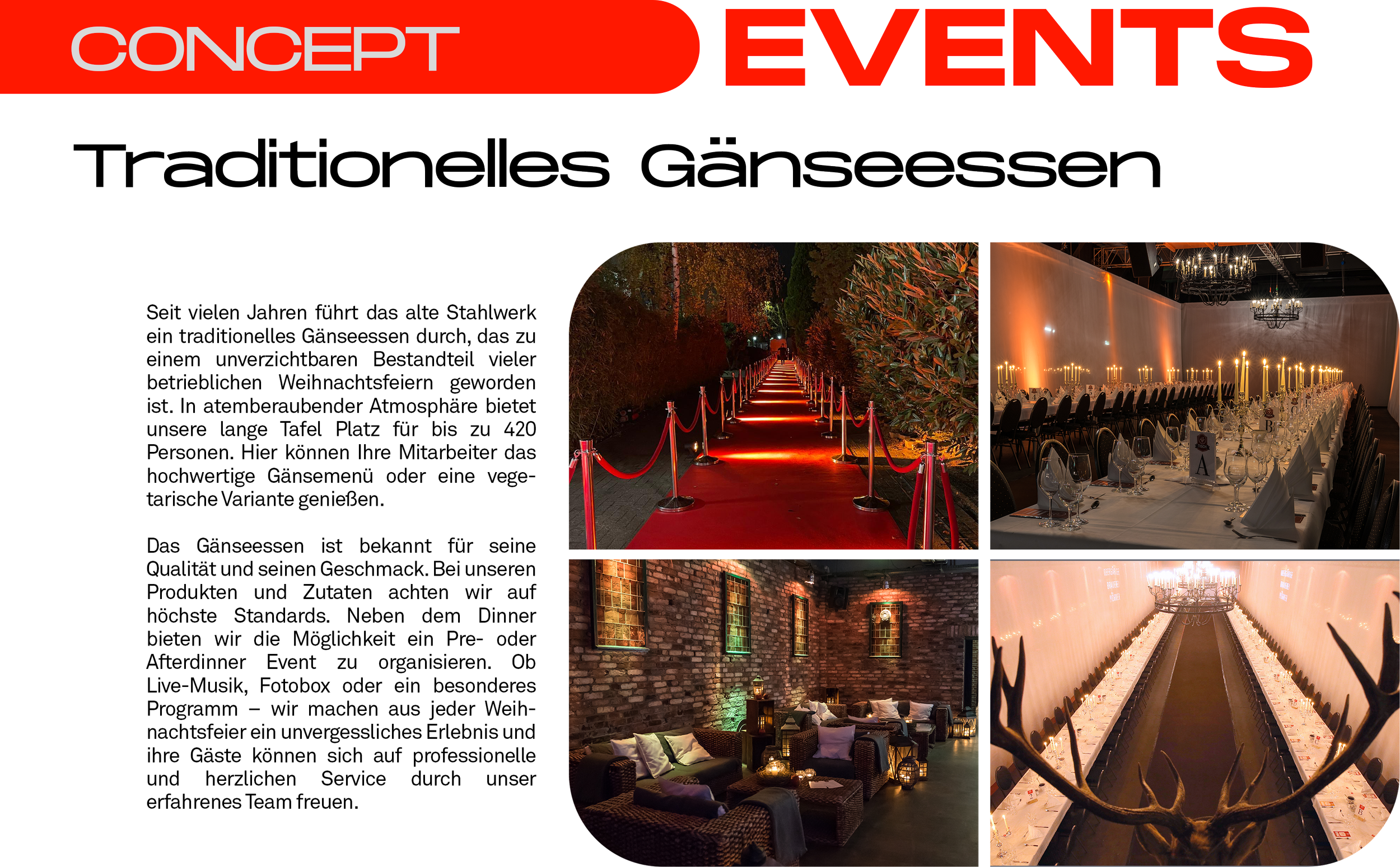 Flyer für ein traditionelles Gänseessen im alten Stahlwerk, mit Text und Bildern. Der Text beschreibt ein jährlich stattfindendes Gänseessen-Event zu Weihnachten. Die Bilder zeigen einen roten Teppich, eine festliche Tafel, Kerzenbeleuchtung und eine gemütliche Lounge mit Backsteinmauern.